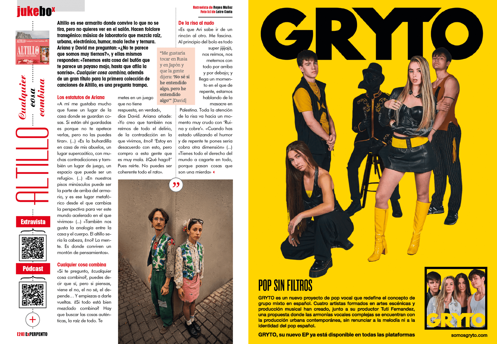 Es ese armarito donde convive lo que no se tira pero no quieres ver en el salón. Lo llaman folclore transgénico, es música hecha en un laboratorio que mezcla música de raíz, urbana, electrónica, humor, mala leche y ternura. Ariana y David levantan un proyecto que parte de la contradicción —«¿No te parece que somos muy tiernos?», me preguntan y ellas mismas responden: «Tenemos esta cosa del bufón que te parece un payaso majo, hasta que se le afila la sonrisa»—. Cualquier cosa combina, además de un gran título para la primera colección de canciones de Altillo, es una pregunta trampa. Porque no: por mucho que los algoritmos, raudos y veloces, se empeñen en batirlo todo, no todo combina.